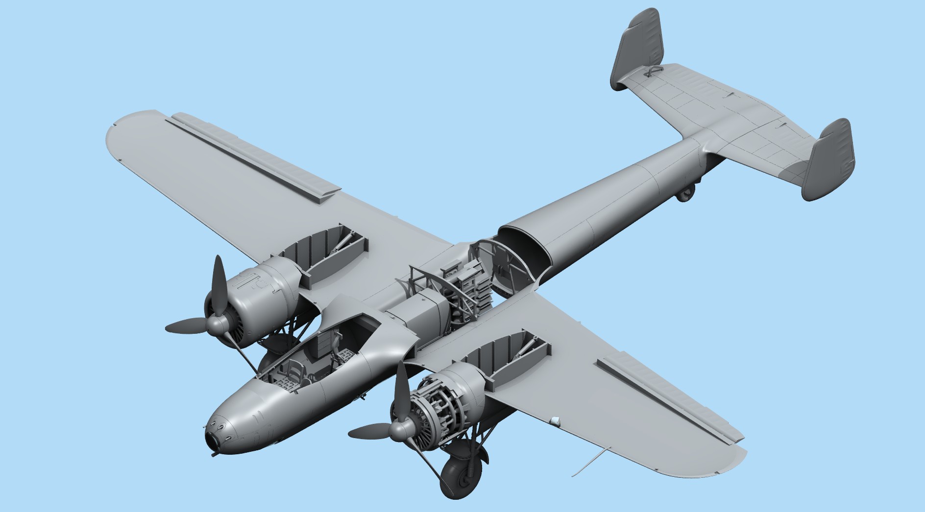 Детализированная кабина с проработанными местами экипажа, элементами управления и панелью приборов, радиооборудованием, детально проработанные боковые стенки.